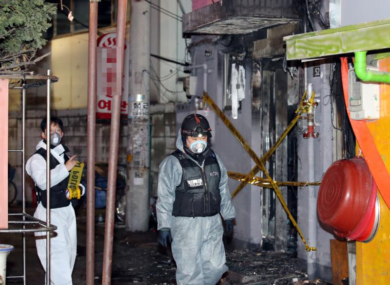 圖:首爾一家小型旅館20日凌晨起火,警方封鎖現場/韓聯社