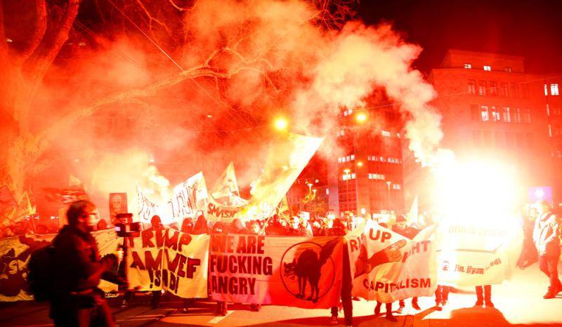 本月13日,就有數百名反資本主義示威者在瑞士首都伯爾尼遊行,抗議特朗普到訪及準備參加達沃斯世界經濟論壇。示威者高舉寫有「吃掉有錢人」、「對抗世界經濟論壇、特朗普、資本主義」等標語。除了針對特朗普外,他們也把矛頭指向參加世界經濟論壇的其他政界和商界精英。