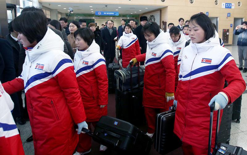 圖:朝鮮女子冰球代表團25日抵達韓國