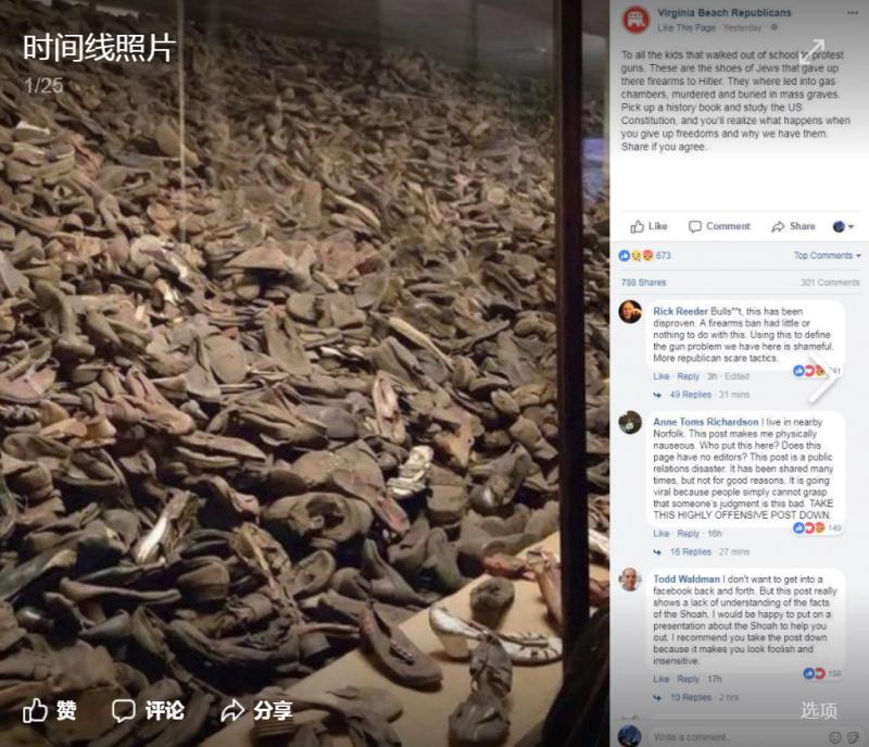 貼文寫:「這些鞋子的主人正是被希特勒奪去槍支的猶太人。他們被帶去毒氣室殺害之後埋在亂葬崗。找本歷史書、看看美國憲法,你就會了解,當你放棄擁槍自由會發生什麼。」