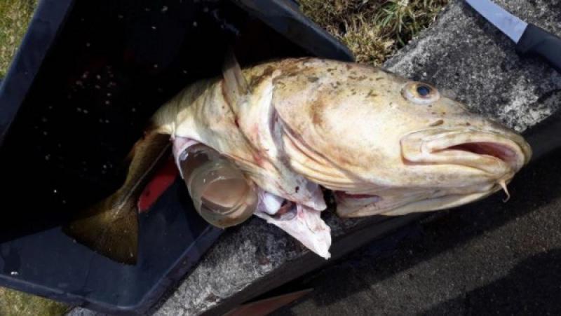 圖:挪威漁民6日捕到的一條鱈魚,肚內驚現半截大膠樽\網上圖片
