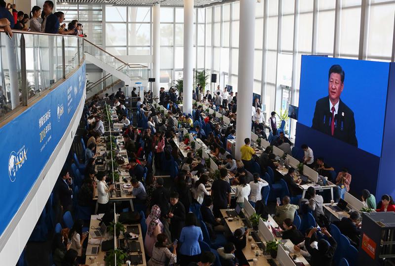 圖:各國記者10日在博鰲論壇觀看習近平主席演說/法新社