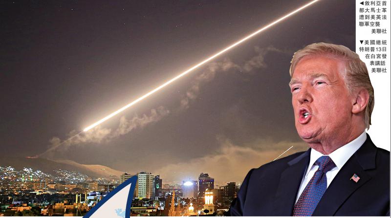【大公報訊】綜合美聯社、路透社、新華社報道:美東時間13日晚9時許(香港時間14日早晨10點),美國總統特朗普在白宮宣布下令對敘利亞涉及化武的地點發射導彈進行精確打擊,又說這次是美國和盟友英國和法國的聯合行動,旨在遏止敘利亞政府使用化學武器。報道指,美英法聯軍向敘利亞發射了103枚導彈,造成至少6名敘利亞平民受傷。俄羅斯總統普京14日表示,這是一場侵略行為,違反了所有國際法準則,警告西方聯軍需為其行動「承擔後果」。