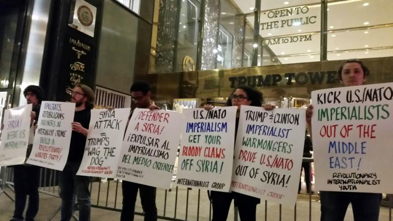 圖:各國人民13日在紐約特朗普大樓外抗議美國攻打敘利亞/美聯社