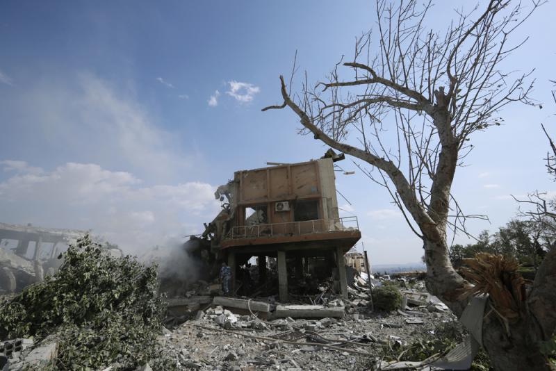 圖:消防員14日為受空襲的敘利亞科學研究中心滅火 美聯社