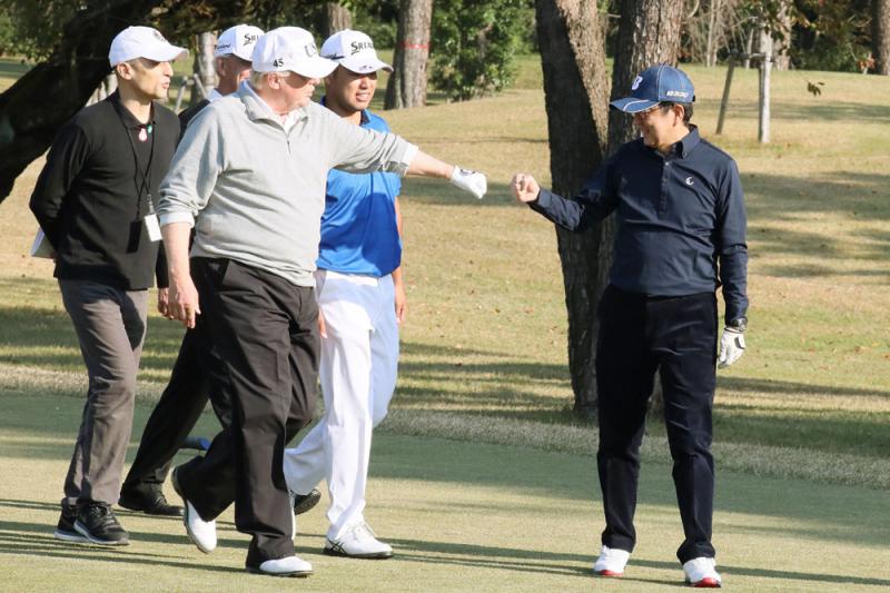 圖:去年11月,特朗普訪日時與安倍(右)一起打高球 資料圖片