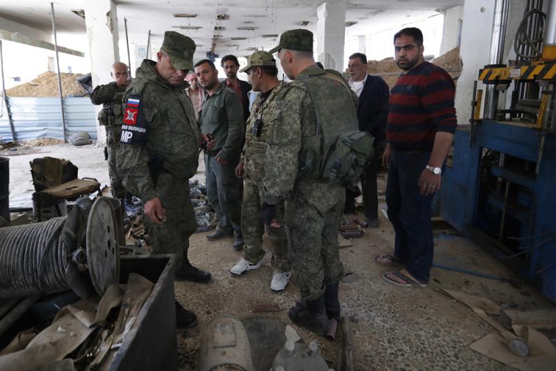 圖:俄羅斯軍方人員16日在敘利亞杜馬鎮查看戰後現場 美聯社