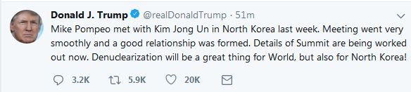 大公網4月18日訊 當地時間18日,美國總統特朗普發布推特稱,邁克·蓬佩奧上周訪問朝鮮,並會見了朝鮮最高領導人金正恩。二人的會面進行的很順利,並形成良好關係。