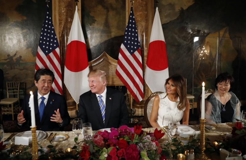 圖:美國總統特朗普(左二)18日在海湖莊園招待日本首相安倍晉三(左一) 美聯社