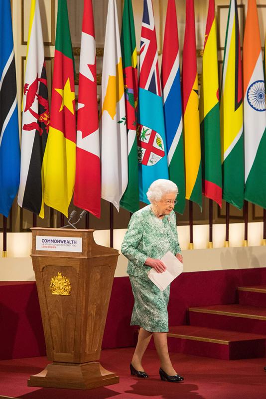 圖:英女王伊麗莎白二世19日結束英聯邦政府首腦會議發言後離開講台/法新社