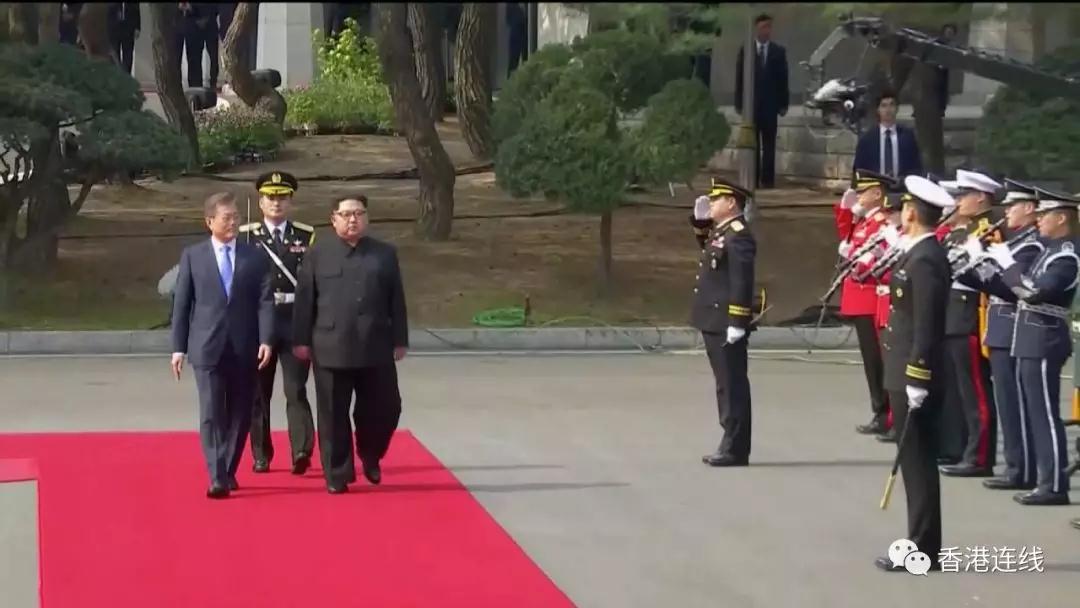 香港時間8點40分兩位領導人抵達位於「自由之家」與 「和平之家」之間的板門店廣場,檢閱韓國儀仗隊。300多名儀仗隊隊員身着多彩民族服裝、吹奏民謠《阿里郎》。