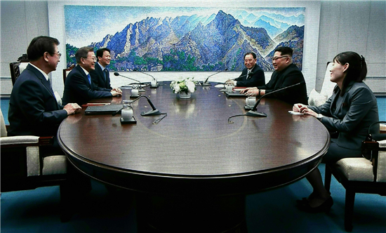 金正恩向文在寅承諾朝鮮不會繼續進行導彈試射活動,並笑稱文在寅以後不再會因試射而早起開會了。圖為會談畫面(新華社)