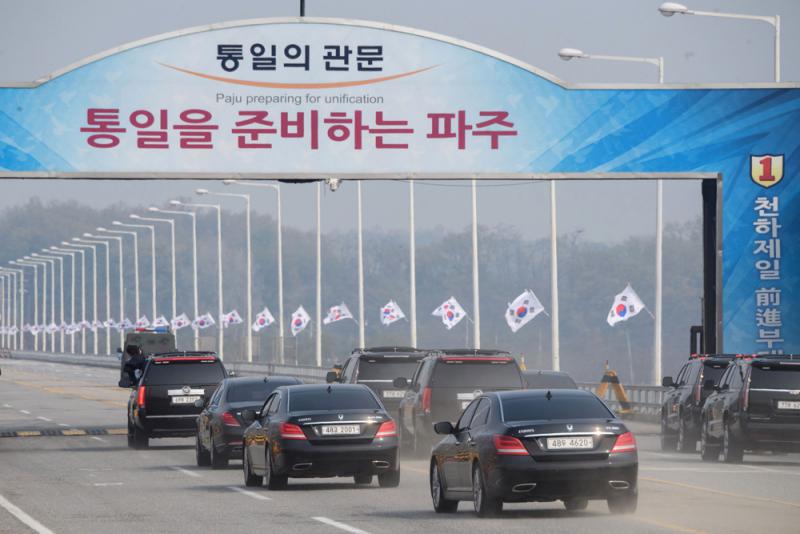 圖:韓國總統文在寅的車隊27日經過統一橋 法新社
