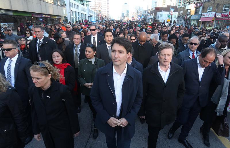 圖:加拿大總理特魯多(中)4月29日在多倫多參與悼念活動\路透社