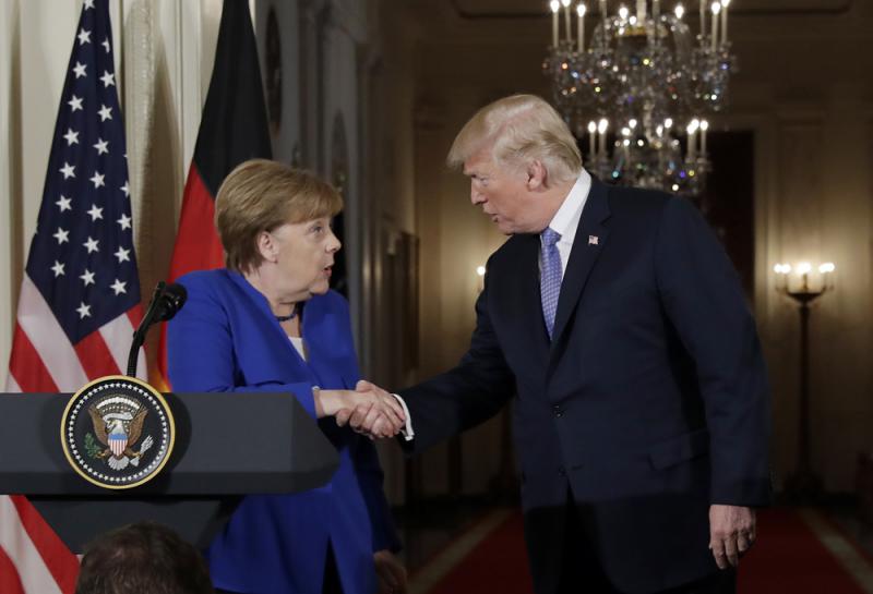 圖:德國總理默克爾(左)4月27日在白宮與特朗普舉行聯合記者會\美聯社