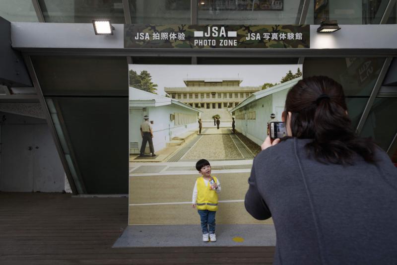 圖:一名兒童在板門店和平村的背景板前拍照\法新社