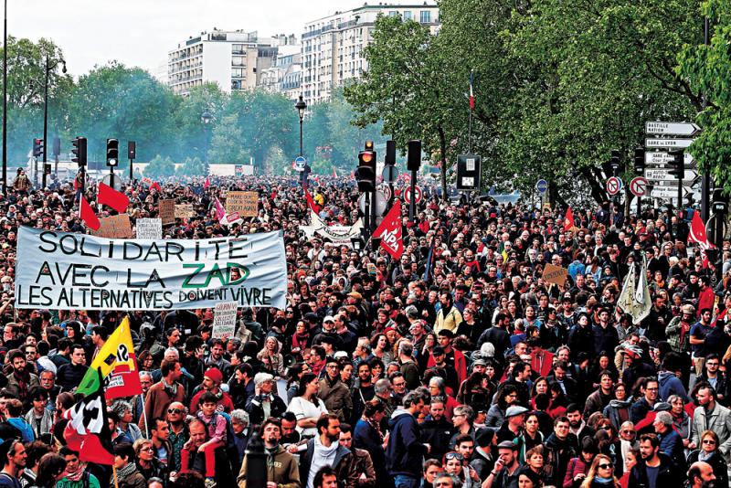 首都巴黎當日有約5.5萬人響應工會號召,從巴士底廣場開始遊行,然而傍晚時分突然混入1200名穿黑衣、蒙面的身份不明激進分子,他們在人群中高喊「大家都恨警察」、「巴黎快反抗吧」,又在塞納河左岸一帶縱火、燒車、砸毀一家麥當勞。
