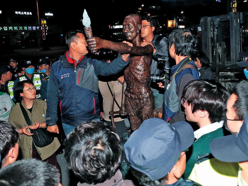 民間組織計劃在日本總領館前的「慰安婦」受害少女像旁,設立一座日本殖民時期強徵勞工銅像,以提醒世人銘記歷史。不過釜山政府認為,根據道路交通法,建議另設他處。但最終,大約100名民間團體成員仍按照原定計劃將銅像運至日本領館門口,遭到約500名警察的阻攔,雙方進行了長達12小時的對峙。目擊者稱,有10名抗議者在與警方的衝突中受傷。