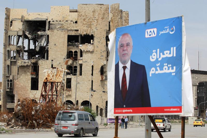 圖:伊拉克摩蘇爾在打擊ISIS的戰爭中嚴重受損,圖為摩蘇爾舊城的一個阿巴迪競選廣告/法新社