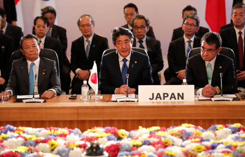 圖:安倍(前排中)與麻生太郎(前排左)9日在東京出席中日韓高峰會/法新社