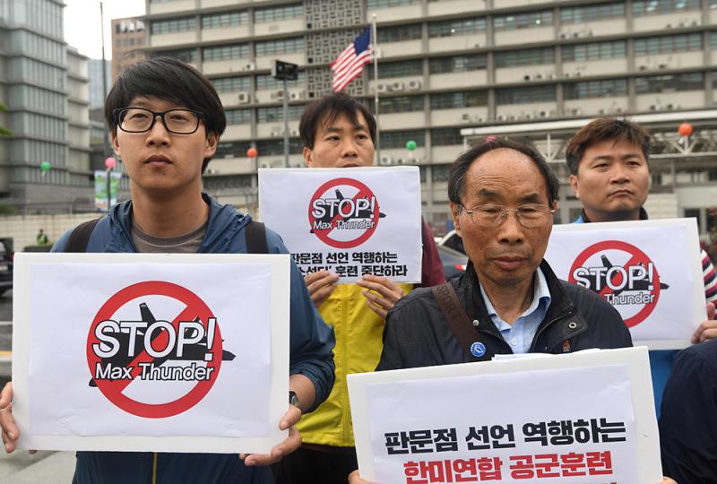 圖:韓國民眾16日示威反對「超級雷霆」軍演/法新社