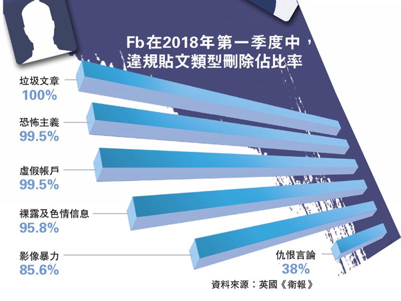 Fb在2018年第一季度中,違規貼文類型刪除佔比率