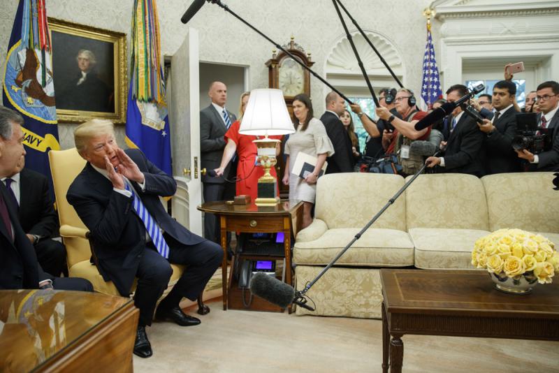 圖:美國總統特朗普16日在白宮橢圓形辦公室說未獲峰會取消的通知/美聯社