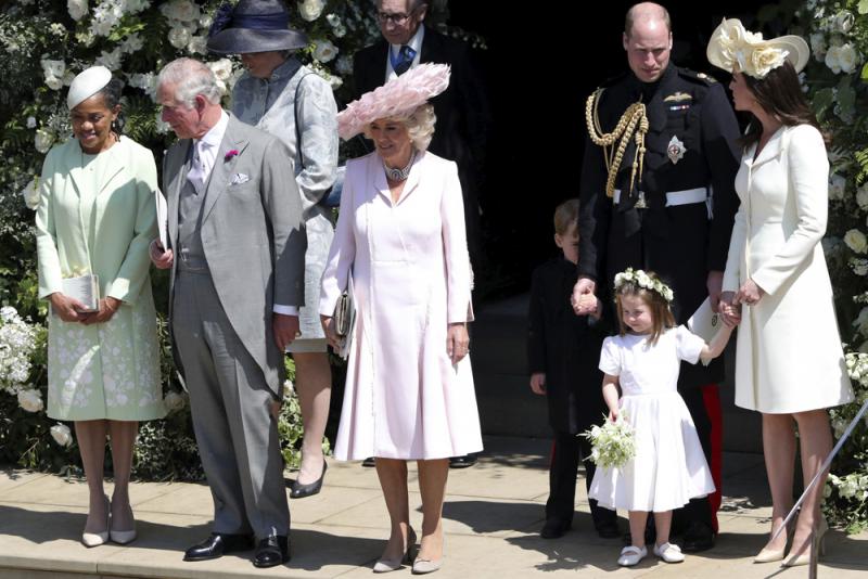 圖:梅根母親、查爾斯王子伉儷和威廉王子一家(從左至右)在聖喬治禮堂門口等候\美聯社