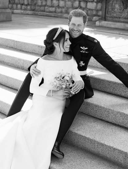 三張照片包括一張獲封為薩塞克斯公爵的哈里王子與公爵夫人梅根的黑白合照,另一張則是一對新人與10名花童的合照,以及是王室四代同堂及梅根母親拉格蘭(Doria Ragland)和花童的照片。