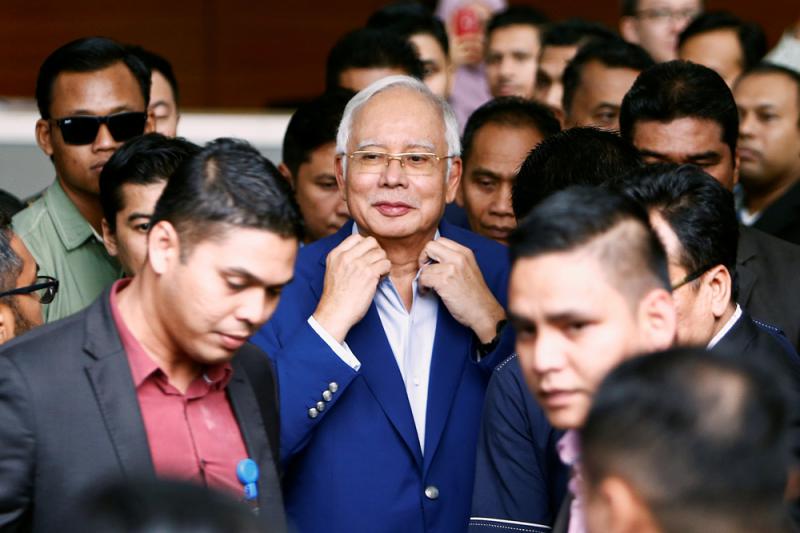 圖:馬來西亞前總理納吉布(中)22日離開反貪委員會總部\路透社