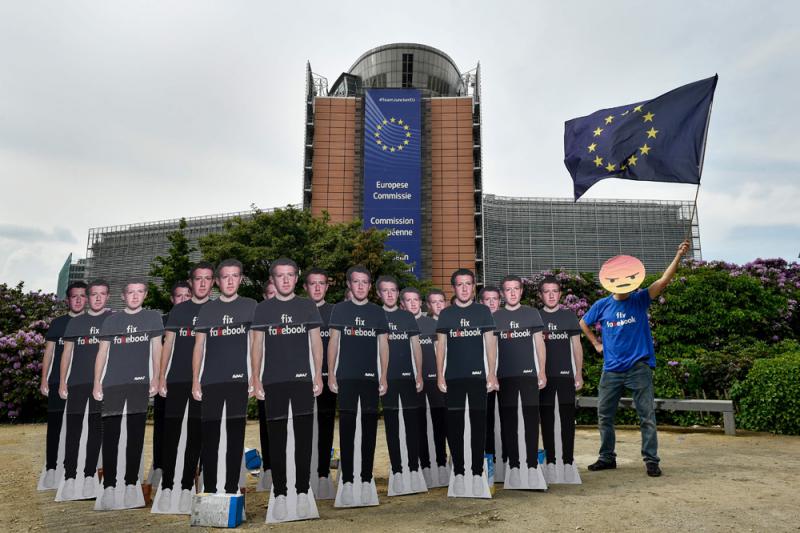 圖:示威人士22日在歐洲議會大樓前放置朱克伯格的人形紙牌\法新社