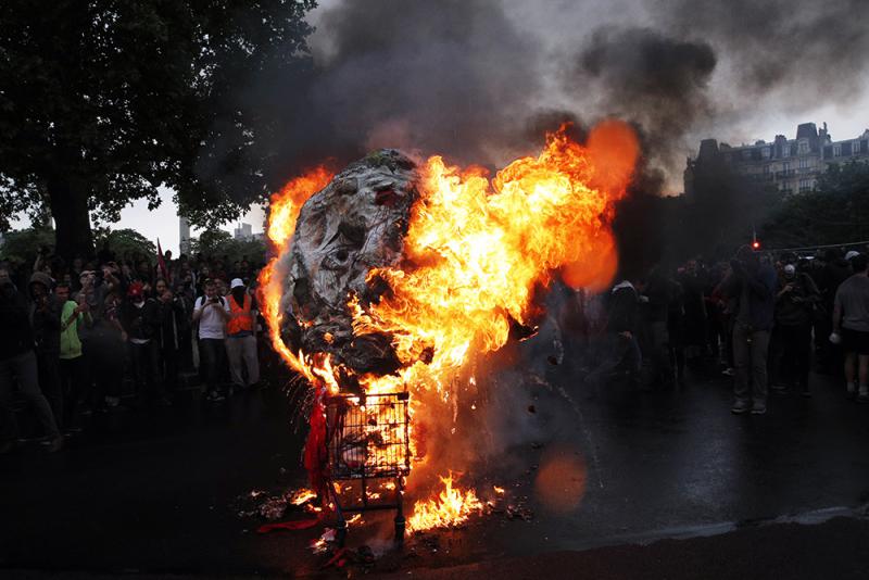 圖:法國示威者22日燒毀一幅馬克龍畫像 美聯社