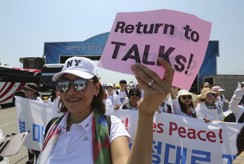 圖:韓國民眾25日在朝韓非軍事區呼籲美朝「回歸對話」\美聯社