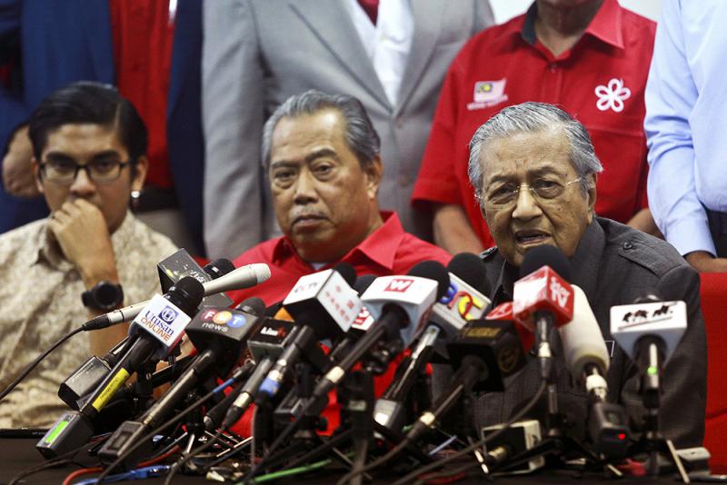 圖:馬哈蒂爾(右一)28日召開記者會,宣布棄建星馬高鐵 美聯社