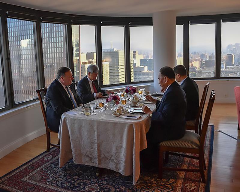 圖:美國國務卿蓬佩奧(左一)與到訪的朝鮮統戰部部長金英哲共進晚餐\法新社