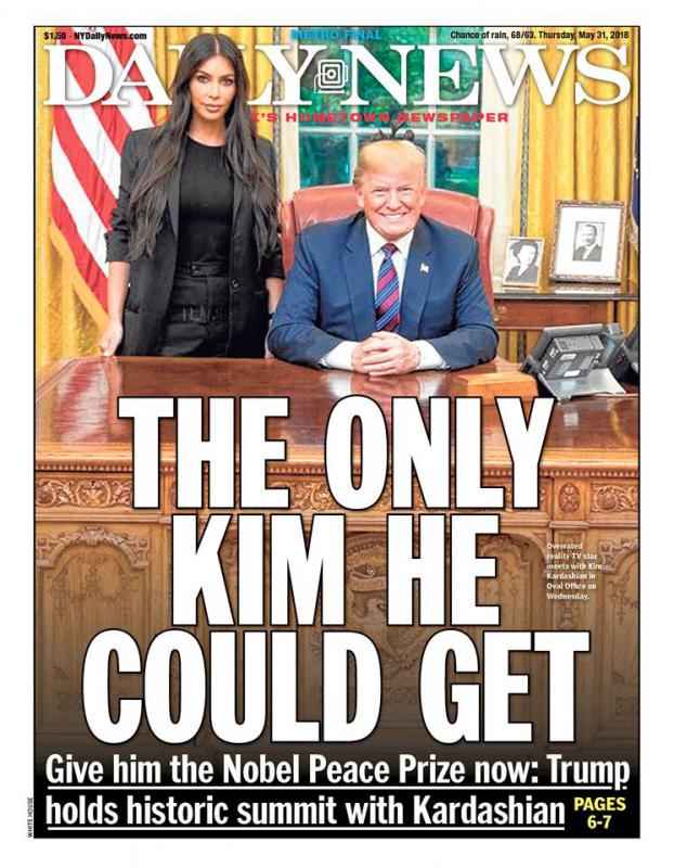 周四出版的美國小報《紐約每日新聞》封面便是此次「特『金』會」,大字標題寫着「特朗普目前能見到的唯一一位姓金的人」。