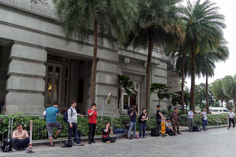 圖:多名記者在富麗敦酒店外待命。朝鮮國務委員會部長金昌善於上月28日下榻此處\法新社