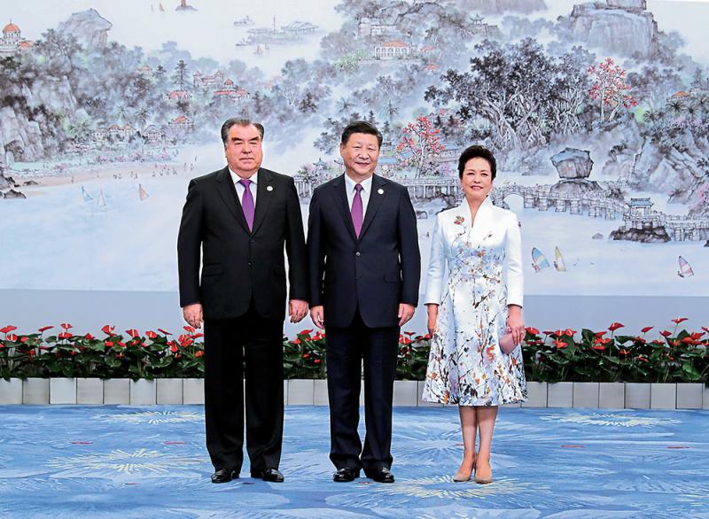 圖:二○一七年九月四日,國家主席習近平(中)與夫人彭麗媛(右)在廈門國際會議中心舉行宴會時迎候塔吉克總統拉赫蒙(左)\資料圖片