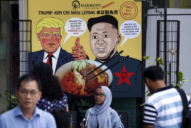 圖:新加坡行人走過一塊印有特朗普和金正恩卡通像的食物廣告牌\美聯社