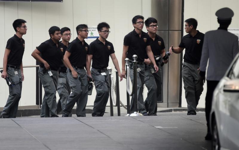 圖:9日,新加坡軍事炸彈處置成員進入瑞吉酒店處理安檢事宜\美聯社