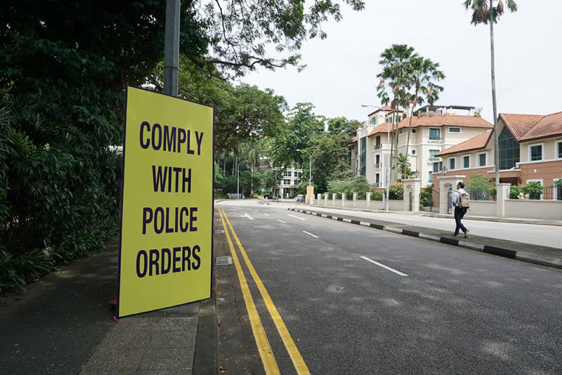 圖:10日下午,香格里拉酒店附近車輛稀少,但隨處可見遵循警方管制的黃色警告牌\大公報記者張佳晴攝