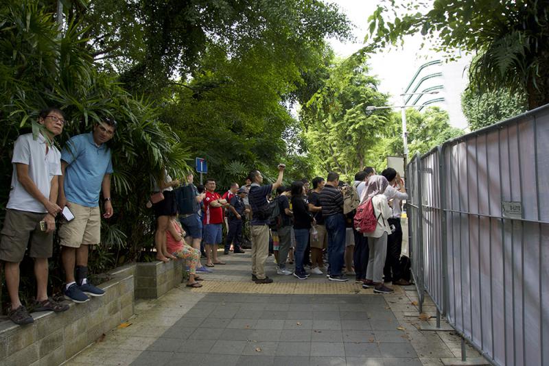相比香格里拉酒店的「平易近人」,瑞吉酒店因為朝鮮領導人金正恩和代表團的入住顯得「凜然難犯」。酒店門口的道路兩邊都是高高的圍欄,另有朝方安保人員和新加坡警員的把守,但在圍欄後面,確是大批傳媒和好圍觀的群眾,人頭攢動也成為當日獅城一道見證歷史的風景線。