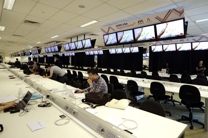 【大公報訊】記者張佳晴新加坡報道:本次報道「特金會」的媒體中心設在金海灣的F1維修大樓,6月10日上午10點開始對登記傳媒開放,13日晚間10點關閉,其間24小時開放。據悉,此次超過2500名記者登記進入媒體中心,其中80%為新加坡外的國際媒體。「特金會」也是新加坡最大型的一次傳媒報道事件。
