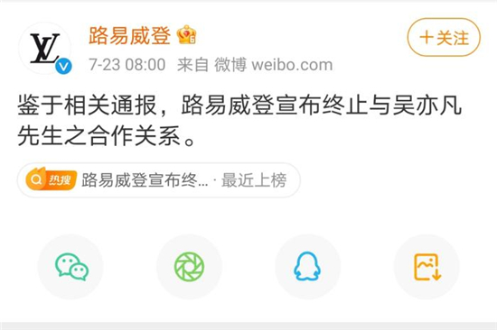 路易威登微博發布消息:鑒於相關通報,路易威登宣布終止與吳亦凡先生之合作關系。