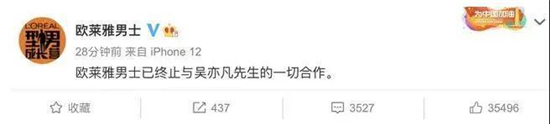 事情並未到此結束。7月20日下午,「歐萊雅男士」官方微博發文宣布:「歐萊雅男士已終止與吳亦凡先生的一切合作。」