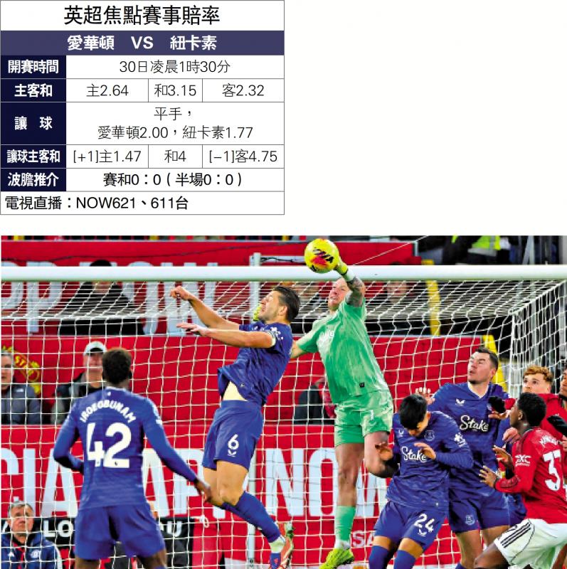 【大公報訊】上輪英超分別勇挫「雙曼」的愛華頓與紐卡素明晨交鋒,愛華頓佔主場之利兼有表現穩健的英格蘭「第一把交椅」比克福特把關,而紐卡素作客成績欠佳,人腳雖秤先但也沒有多大取勝把握,不妨吼「主客和」的和。(NOW621及611台明晨1時30分直播)