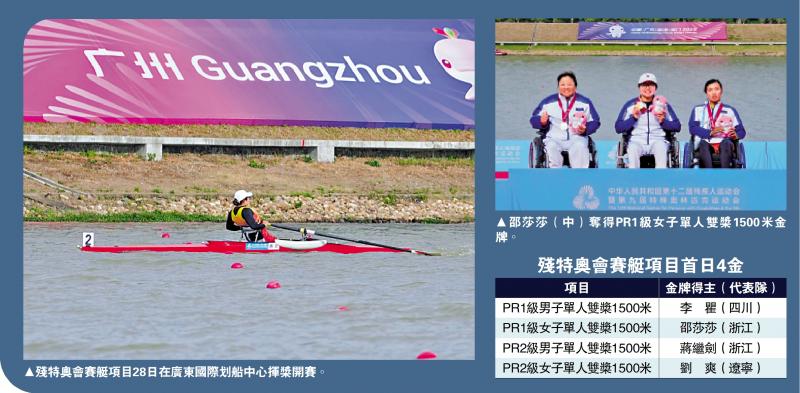 全國第12屆殘疾人運動會暨第9屆特殊奧林匹克運動會(下稱「殘特奧會」)賽艇項目28日在廣東國際划船中心揮槳開賽。首日賽事中,PR1、PR2級男子、女子單人雙槳1500米4個項目先後決出了金牌,金牌選手賽後皆讚賞賽道專業及服務暖心。