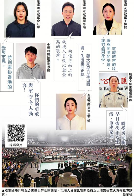 花樣游泳奧運冠軍「姊妹花」王柳懿、王芊懿,前者表示,這段時間,宏福苑火災的消息一直讓她們揪心不已,時刻牽掛着受災的每一位同胞。「香港是我們的第二故鄉,這座城市的冷暖與同胞的安危,我們感同身受。」王柳懿說。