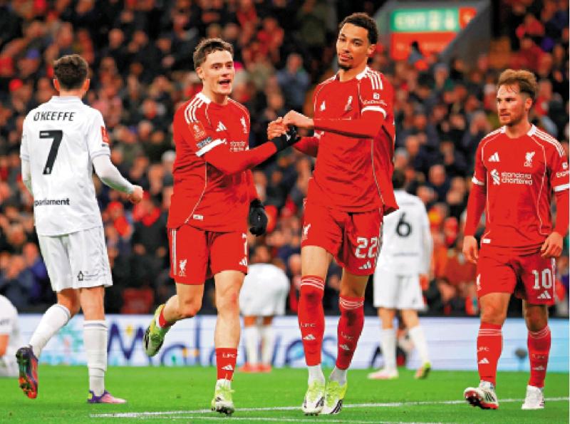 【大公報訊】利物浦(紅衫)在13日上演的英格蘭足總盃第3圈比賽中,主場以4:1大破英甲球隊班士利,終於取得2026年首場勝利。利物浦晉級後,將在第4圈遇上另一支英超球隊白禮頓。第4圈其他焦點對賽還包括阿士東維拉主場對紐卡素,阿仙奴對陣英甲韋根及車路士作客對英冠侯城。\路透社