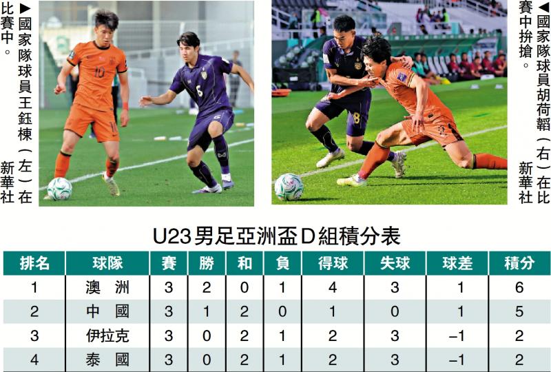 【大公報訊】記者朱家立報道:中國男子U23足球隊14日在沙特阿拉伯出戰U23男足亞洲盃D組最後一輪賽事對陣泰國隊。國家隊是役只需取得1分便可獲得小組出線資格,最終雙方踢成0:0平手,國家隊遂以小組次名的成績歷史性首度躋身8強,將在17日晚上7時30分對陣烏茲別克斯坦,爭入4強。